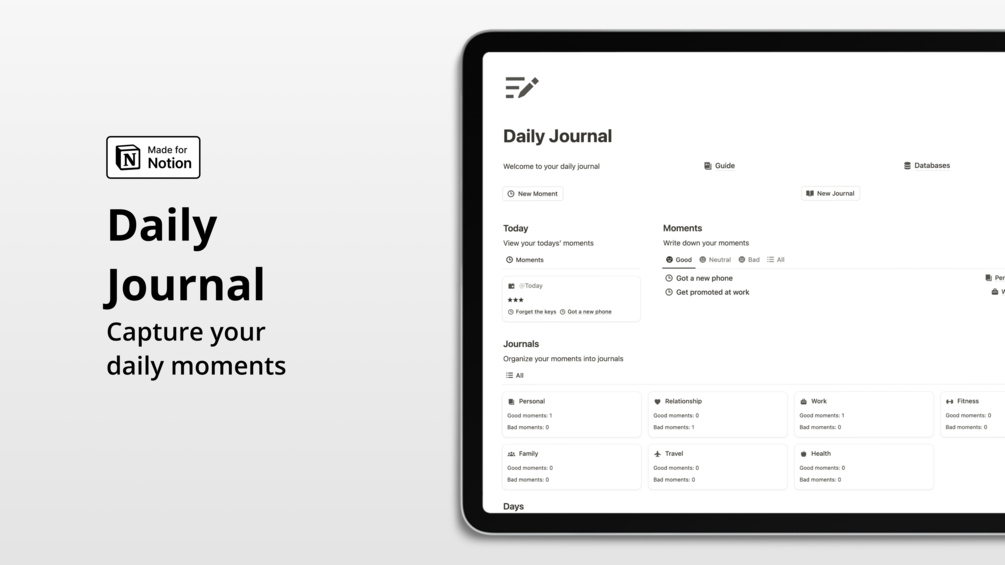 The Daily Journal is made for you! Use this template to jot down your moments, evaluate your days and reflect on yourself.