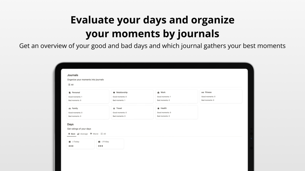 Get an automatic evaluation of your days and see which ones were good or bad. Gather your moments in journals for a better understanding of different areas of your life.