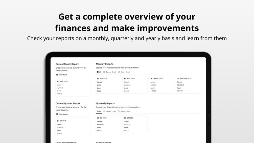 Always stay on top of your earnings and expenses thanks to various reports. Gain a clear understanding of how much money you earn and spend on a monthly, quarterly, or yearly basis. Look for any insights coming from them and try to improve your finances.