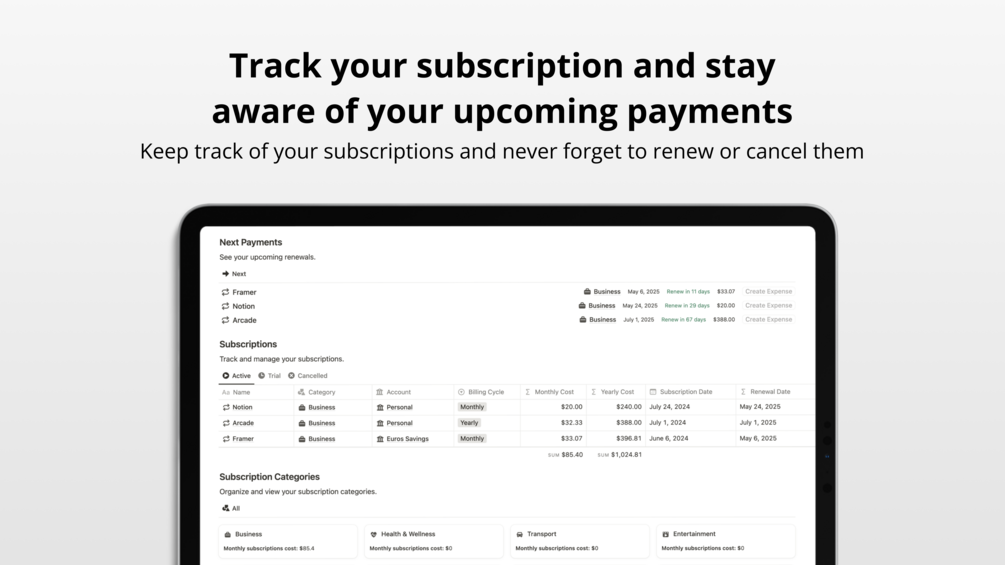 Save and track your monthly or yearly subscriptions to ensure you never forget to renew or cancel them. Get alerted the day before your renewal to be sure to maintain your finances on time.