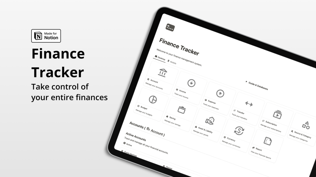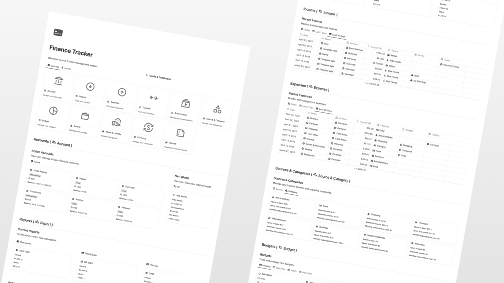 Introducing a comprehensive finance system built within Notion, designed for anyone looking to take control of their finances. Whether you need to manage multi-currency accounts, track income, expenses, and subscriptions, set budgets and savings goals, and access automatic financial reports, the Finance Tracker has you covered. With a one-time purchase, you’ll be empowered to take control of your money and maintain it for good.