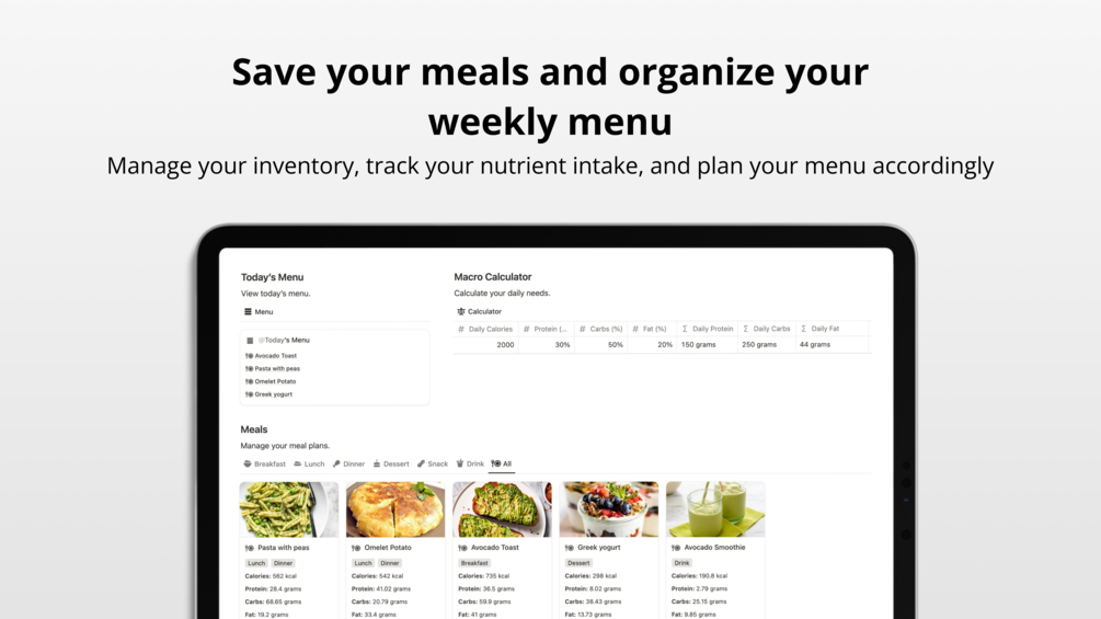 Keep track of your food inventory and set meal ingredients to automatically calculate nutrient intake. This helps you meet daily requirements and plan your weekly meals with ease.