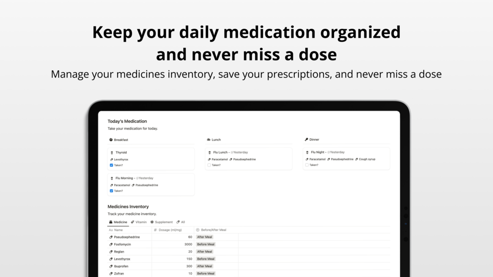 Manage your inventory of medicines, vitamins, and supplements. Save your prescriptions with the start date and duration to automatically access your daily medication schedule. This way, you'll never miss a dose.