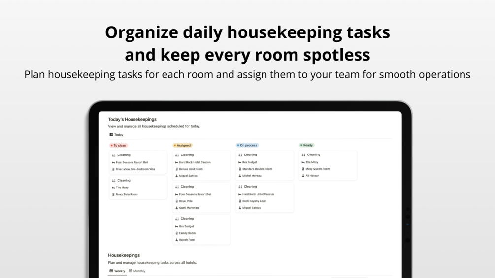 Organize and schedule all your daily housekeeping tasks by room and by hotel. Assign tasks to the right team members based on availability or role, and ensure each room is cleaned, inspected, and fully prepared before your guests arrive. Maintain high standards of cleanliness to deliver the best guest experience.