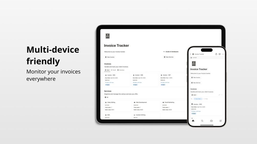 Track your client's invoices and manage your services with the Invoice Tracker Notion template.