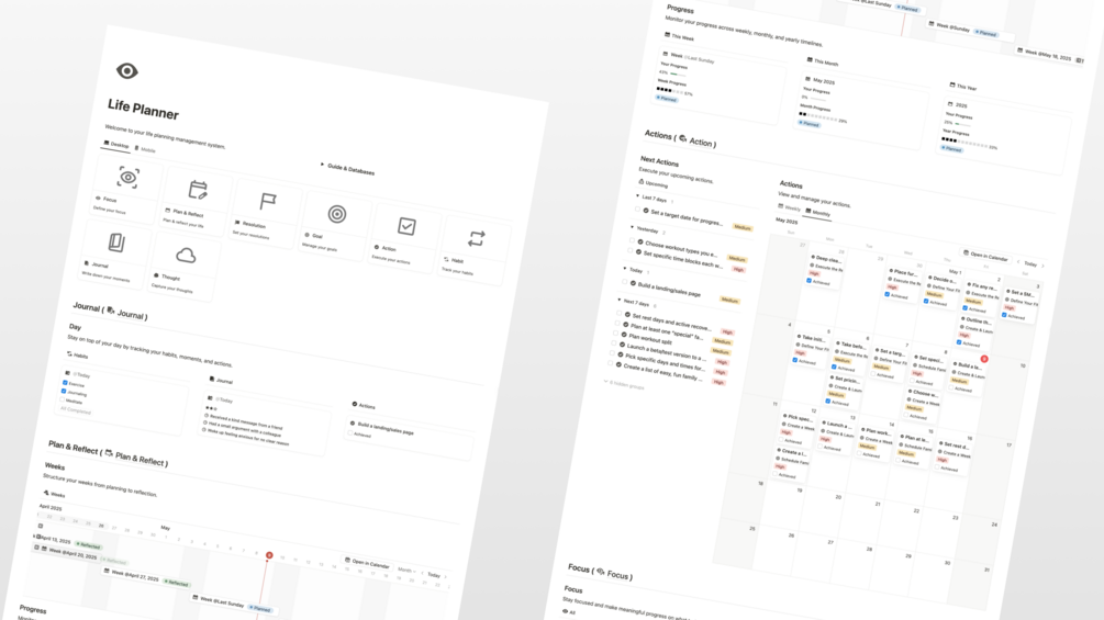 Introducing a comprehensive planning system created for individuals who aim to stay focused on their goals year-round, built right within Notion. Whether you seek personal development, financial security, or any other significant objectives, the Life Planner is designed to keep you on course. With this one-time purchase, you will be guided to plan your life and achieve your goals effectively.