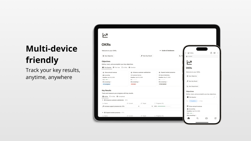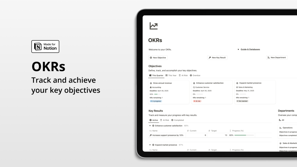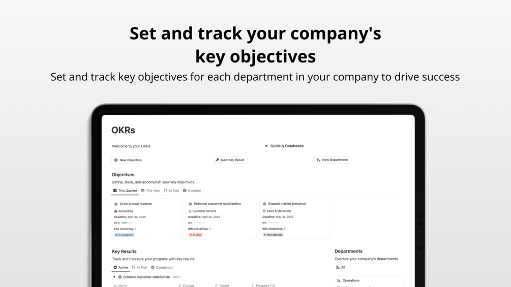The OKRs template is designed for you! This powerful tool helps you define and monitor key objectives for each department, track progress through key results, and drive your business towards success.