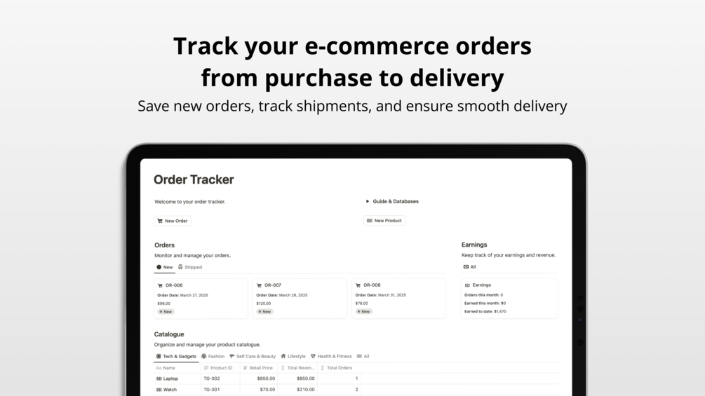 Track your e-commerce orders and manage your product catalogue with the Order Tracker Notion template.