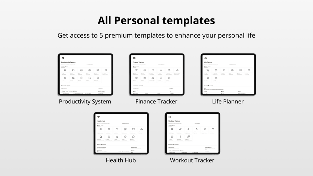 Get exclusive access to a bundle of all current and future premium personal templates—designed to help you enhance your personal life—at a $136 discount!