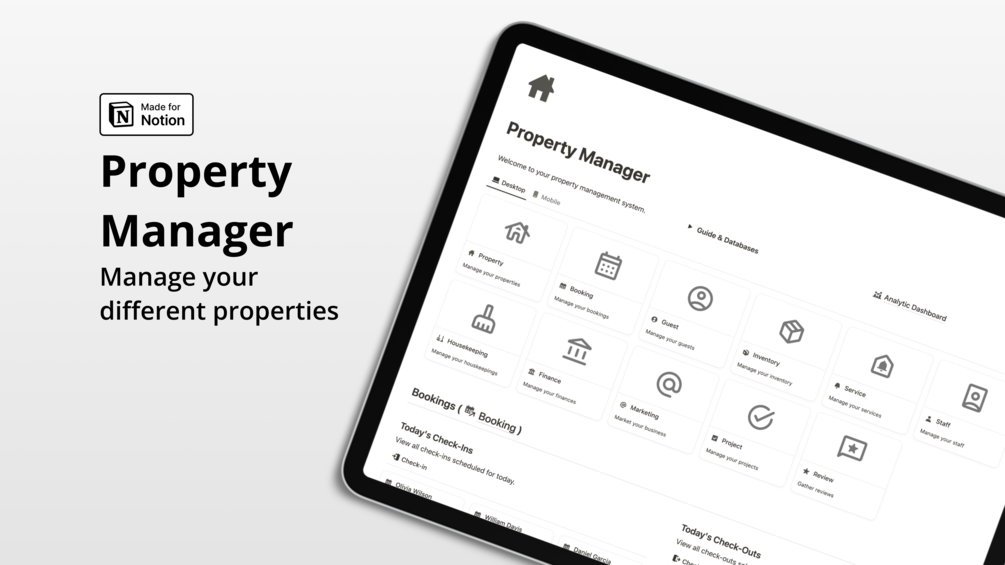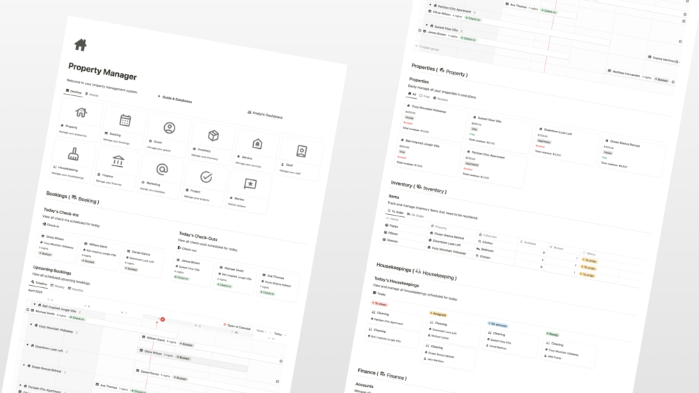 Discover the all-in-one Notion system built specifically for property owners. Effortlessly manage multiple properties from a single place—create custom guest handbooks, track availability and bookings, organize guest and staff details, streamline housekeeping, monitor inventory, and oversee finances. With just one system, gain total control and clarity to run your properties more efficiently and professionally.