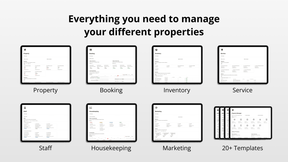 Discover the all-in-one Notion system built specifically for property owners. Effortlessly manage multiple properties from a single place—create custom guest handbooks, track availability and bookings, organize guest and staff details, streamline housekeeping, monitor inventory, and oversee finances. With just one system, gain total control and clarity to run your properties more efficiently and professionally.