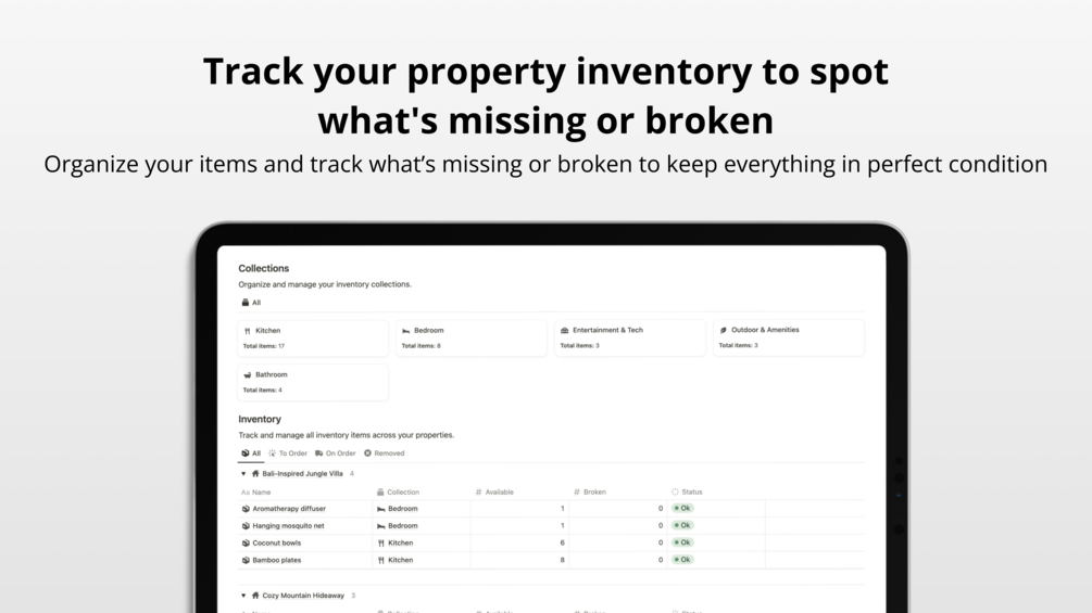 Organize your property items into clear collections. Track each item to quickly identify what’s missing or damaged, and easily reorder supplies to keep your properties in perfect condition at all times.