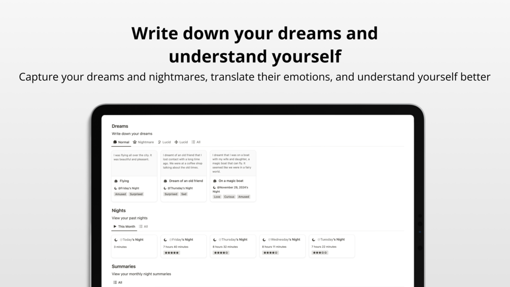 Capture your dreams, whether they are normal, nightmares, lucid, or symbolic. Translate their emotions and use them to gain insight into yourself.