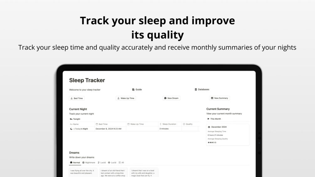 The Sleep Tracker can help you solve this problem! Use this template to track your nights, evaluate the quality of your sleep, and capture your dreams.
