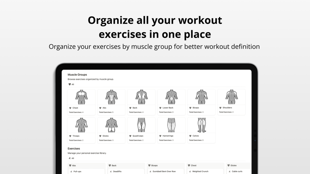 - Exercise – Create and organize exercises by muscle group for easy access.