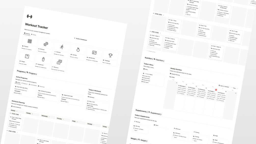 Introducing a comprehensive workout system built within Notion for anyone looking to plan and track their workouts. Whether you need to define workout programs, schedule your week, manage exercises and nutrition, track your weight, or jot down workout challenges, the Workout Tracker has you covered. With a one-time purchase, you'll be guided to plan and track your workouts effectively.